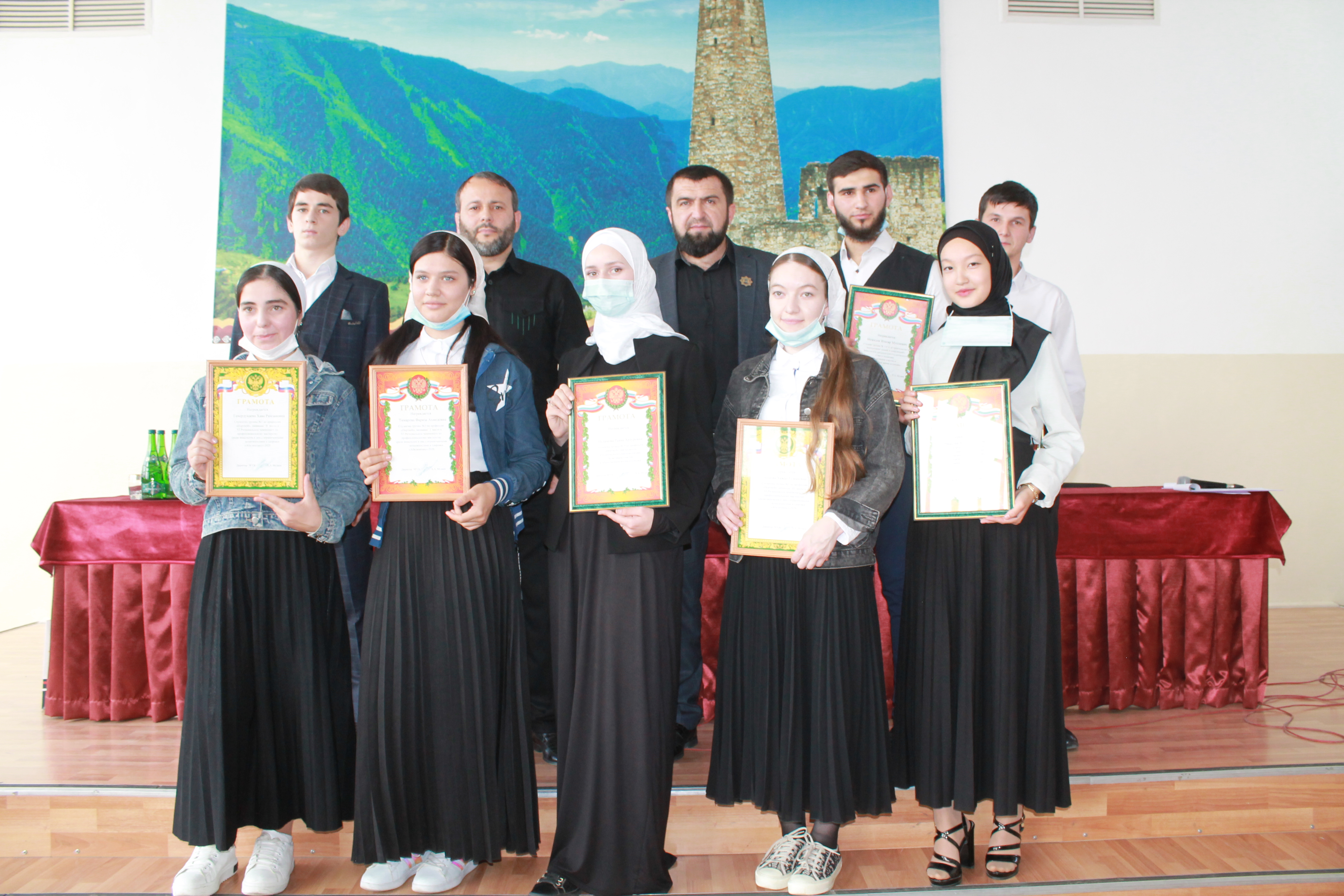 Награждение победителей VI Регионального чемпионата «Абилимпикс», по профессиональному мастерству среди инвалидов и лиц с ограниченными возможностями здоровья, занявшие призовые места: Тимарова Ф.А.; Генердукаева Х.Р. и Аюбова Х.У.