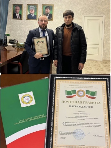 По поручению Управляющего делами Главы и Правительства Чеченской Республики С.В. Микиева директору Чеченского государственного строительного колледжа Амхадову Артуру Вагидовичу вручили Почетную грамо